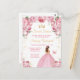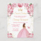 This elegant and glamourous sweet sixteen birthday invitation features a beautiful princess with brown hair in a blush pink ball gown. The text combines handwritten script and modern sans serif fonts for a classy and sophisticated look. The floral arrangements, butterfly and gold confetti create the perfect blend of rustic and chic.