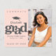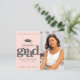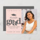 Announce to the world that your favourite grad has reached their milestone with this stunning, simple, modern, personalised budget announcement invite. Bold, graphic, soft grey typography and cap icon overlay a soft blush pink background. On the right hand side, add a photo of your choice. Personalise the custom text with your graduate’s name, school name, date, and class year. On the back, add your personal note, next school they’re attending, party information, etc. Guaranteed to add stylish fun to their special occasion!