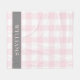 This chic blush pink and white buffalo check pattern blanket has a grey strip on the bottom with a family name in blush pink text. Personalise with your own name or to give as a gift.