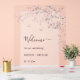 Blush pink cherry blossom floral transparent wedding welcome reception board.
