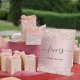 A blush pink gradient background with confetti. Favours is written with a modern hand lettered style script with swashes.