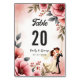 This elegant watercolor floral wedding table number is perfect for a modern wedding. The romantic design features an elegant watercolor floral frame with a bride and groom illustration and black calligraphy on a white background.