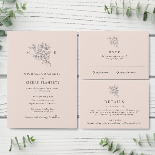 Blush Pink Elegant Botanical Monogram Wedding Invitation