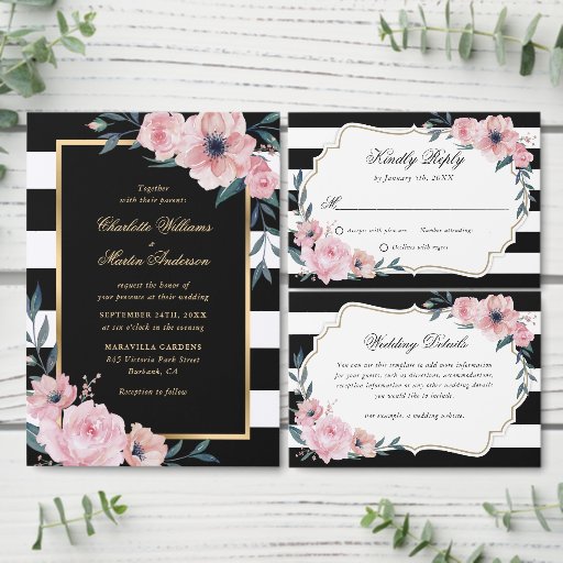 Beautiful watercolor floral bridal shower invitations featuring pink flowers against a black and white striped background. Matching items available.