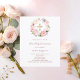 White background, decorated with watercolored pink and white flowers in a wreath and a golden cross. Personalize and add a name and details.