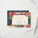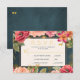 Editable text wedding RSVP with menu options featuring romantic blush pink and peach roses and blooms, two small golden hearts and a golden frame on dark midnight navy blue chalkboard background. ----------- Ideal for spring or summer night | garden outdoor | vintage romantic themed wedding.
