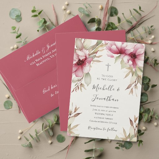 Christian wedding invitation depicts elegant spring and summer botanical garden floral watercolors with beautiful blush pink flowers and greenery. It features a cross and inspirational quote, "To God be the Glory." If there is something you don't see or if you would like changes please contact me with the chat button on the Zazzle page.
