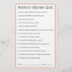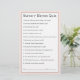 A cute idea as a baby shower game, this question and answer game features much beloved nursery rhyme questions. Each guest gets a game sheet and fills in their answers. Once everyone has completed their answers, the host or game caller calls out the questions and provides the correct answers. The guest with the most correct answers wins a prize! This design in blush pink with a floral pattern on the back coordinates with a "baby in bloom" baby shower collection in this pink floral theme . Here are the answers to the questions on the game card: 1. Christmas pie. 2. four and twenty. 3. a peck of pickled peppers. 4. butcher, baker, candlestick maker. 5. full of grace. 6. a pony. 7. to fetch a pail of water. 8. kissed them. 9. the Farmer's wife. 10. a bone. 11. his supper. 12. a pieman. 13. silver bells, cockle wheels, pretty maids all in a row. 14. a pig