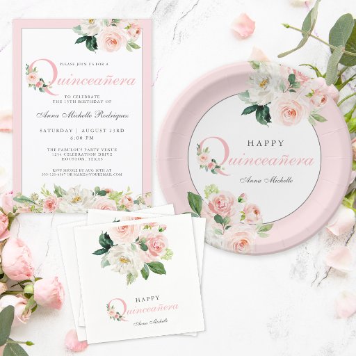 Blush Pink Floral Quinceanera Celebration Invitation
