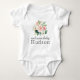 A sweet design for a newborn, this custom baby bodysuit has a floral bouquet of watercolor roses and eucalyptus and trailing greenery in soft blush pink, white, green and blue-green. The text template includes a pairing of handwritten script and serif type faces. Designed for a baby girl, the text may be personalised with any name. Shown here in the newborn size, other sizes are available.