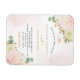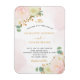 A white background with soft blush pink brush strokes. Decorated with watercolored flowers, florals pink roses, white orchids and a yellow gerbera, eucalyptus greenery and faux gold sprigs. Personalize and add your monogram as a married couple, names and wedding details. Black and golden colored letters.