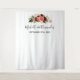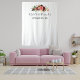 A clean white elegant background for a photo backdrop. Flowers in burgundy, pink and purple and green foliage. Template for the bride and groom's names and the wedding date. Black letters. Simple and elegant.