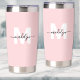 Create Your Own Stylish Modern Custom Girly Blush Pink Name Monogram Travel Mug. This cute and chic travel mug is perfect for anyone with a love for travel and a girly sense of style. The design features a soft blush pink background with a bold white initial on both sides, overlaid by your name in elegant black script for a personalised touch you’ll see from any angle. With its sleek, double-sided monogram and functional design, this mug is great for sipping coffee or tea on the go—whether you're commuting, heading to class, or jet-setting across the globe. All colours can be customised to match your style. A great gift for moms, sorority sisters, best friends, or anyone who loves a little wanderlust with their morning drink!