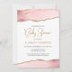 This trendy baby shower invitation features a top and bottom border of watercolor agate geode in shades of blush pink with faux gold glitter highlights. The words "Baby Shower" appear in faux gold glitter in decorative modern handwriting font. Customise it with the name of the mum-to-be in gold coloured text and the party details in charcoal grey on a white background. A matching blush pink and gold agate image appears on the reverse side.