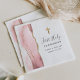 The left-hand edge of this elegant napkin features a blush pink watercolor agate border trimmed with faux gold glitter. A faux gold foil cross appears above the customisable text, which combines handwriting, copperplate and italic fonts in charcoal grey on a white background. Personalise it with the name of the guest of honour and the date.