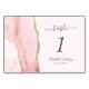 The left-hand edge of this elegant modern wedding table number card features a blush pink watercolor agate border trimmed with faux gold glitter. The customisable text combines charcoal grey handwriting, italic and copperplate fonts on a blush background.