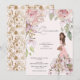 A beautiful, elegant Quinceañera birthday invitation in blush pink and gold tones. This beautiful invitation features a glamourous, fashionable girl in a pink floral dress embellished with gold glitter accents, a gold glitter purse, and gold jewellery. There is a coordinating floral frame at the top, all on a blush pink background. "Quinceañera" is written in a modern, hand lettered script typography. The back of the card features an all over blush pink and gold glitter brocade motif. Copyright Elegant Invites, all rights reserved.
