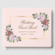 Elegant blush pink and gold floral wedding guest book featuring blush pink flowers and greenery framing the wedding details inside a gold frame. Matching items available. Easily personalise this template online.