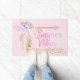 Girly blush pink and gold boho floral feather Summer Vibes doormat. This pretty doormat features the words "Summer Vibes" in hot pink, purple and aqua, with gold glitter sparkles confetti. This doormat also features a sparkly gold, pink, lilac, purple, blue and turquoise boho feather arrow.