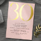 Modern-style 30th birthday invitations with a large heading "30" in real metallic foil. Your event details are printed below in matte black font. Gold accents on a blush pink background. (Background colours can be changed by using the design tool. You may also change the type of metallic foil.)