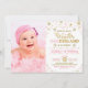 Cute winter-themed first birthday invitation featuring pink and gold snowflakes, faux glitter stars and confetti sprinkles
