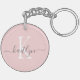 This modern blush pink keychain with your first name in a trendy script font in black and your first initial in a modern cap font in white is perfect for your keys.