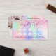 A trendy holographic background with unicorn colors and rainbow colors in pink, purple, mint green.