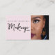 Elevate your beauty brand with this elegant makeup artist business card, featuring a soft blush background, modern handwritten script, minimalist beauty line art, and a customizable circular photo space.