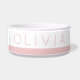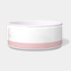 Modern and Simple Custom Printed Ceramic Dog Bowl for food or water with your puppy's name printed on the side with a minimalist single stripe border at the bottom in a modern muted pink shade. The trendy thin sans-serif font will match any type of decor for years.