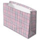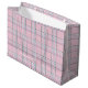Give gifts a cozy touch with this large blush pink plaid gift bag, featuring soft lines of teal and black. A perfect blend of warmth and elegance for holiday gifting.