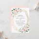Elegant, floral wedding invitations featuring your wedding details surrounded by a faux gold foil geometric frame adorned with bouquets of blush pink, purple, and white watercolor flowers (peonies & roses) and lush green eucalyptus leaves. The feminine floral wedding invitations reverse to a light blush pink background.