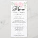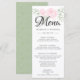 Elegant menu design features blush pink roses nestled in modern greenery. Menu is written in a beautiful large script font. There is room for you to list and describe four courses. You can easily add your information and adjust the position. The back of the menu card is sage green with a very subtle leaf pattern.