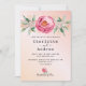 A rose gold and blush pink gradient background. A large pink watercolored rose, foliage with small golden flowers. Personalise and add your names and wedding details. Black letters.