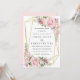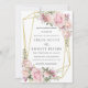 Soft blush pink roses decorate a thin gold geometric frame. Delicate sage green leaves add to the watercolor floral arrangement. A pastel pink watercolor wash sweeps across the back. This pink floral wedding invitation is part of the Summer Romance collection. It contains many DIY wedding templates that let you easily create your stationery and personalise your ceremony and reception.