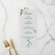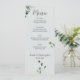 The menu features stunning renderings of eucalyptus leaves, set against a soft blush pink and sage green background. This combination of colours and botanical illustrations creates a tranquil and elegant atmosphere, ideal for a romantic and nature-inspired wedding theme.