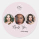 Elevate your beauty brand with this elegant makeup artist thank you sticker , featuring a soft blush background, modern handwritten script, minimalist beauty line art, and a customizable circular photo spaces.