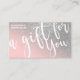 This is the perfect gift certificate business card for a trendy, stylish, girly, and modern businesswoman. This design features a simple white handwritten brush script typography on a faux printed diagonal silver glitter and blush pink ombre gradient glamourous and chic background. It's the perfect way to allow your customers to buy a gift for their family and friends and at the same time promote your business.