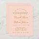 A simple engagement party invitation with a modern colour: blush pink. It has only golden text on blush background. The names are written in an elegant calligraphic script, the rest in caps. the first line is arched text.