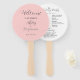 Wedding day program printed on a round style hand fan that features a trendy blush pink colour background on the front side with the bride and groom names in dark grey, stylised script. Back side of program lists the wedding party participants and ceremony rites on a white background with dark grey lettering. Edit hand fan and replace wedding program info with your own. Perfect for an indoor or outdoor wedding ceremony! Select number of hand fan programs desired.