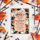 Halloween birthday party invitation with a spooky Halloween frame with pumpkins, cats, ghosts, skulls, toadstools, bats, and autumn leaves against a blush pink background.