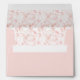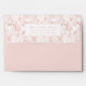 This envelope has a blush pink exterior with a rose pink and white watercolor damask design on the inside and outside flap. The return address is on the outside flap in a pink all-caps serif font with a thin pink border surrounding the address. Behind the address is a coordinating damask design. This envelope coordinates with the other products in the Sweet Crest Monogram Wedding Collection.