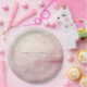 A chic blush pink watercolor wash wedding paper plate featuring elegant pastel gradient designs and clean calligraphy script for spring and summer weddings.
