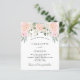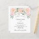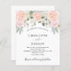 A white background decorated with blush pink and white florals. Personalize and add your names and wedding details. Black colored letters.