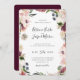 Elegant muted floral frame, wedding invitation. Card features, soft muted flowers and foliage in trendy shades of blush, plum and green. Backing colour is a trendy plum wine purple. Classy typography design style template with coordinating script and bold type.
