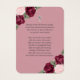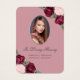 Watercolor red and pink floral memory card/funeral prayer card featuring a photo adorned with blush pink and burgundy red roses and baby's breath on a dusty rose background.