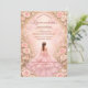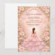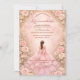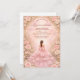 This elegant quinceañera design features a soft blush watercolor background framed by romantic roses, delicate florals, and subtle gold accents, with a graceful gown illustration creating a dreamy, refined atmosphere. The pastel pink palette and floral details give the design a luxurious yet youthful feel, making it perfect for a classic quinceañera celebration with a romantic, garden-inspired aesthetic.