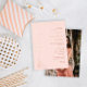 Elegant rose gold graduation invitation in blush pink with brass coloured text and rose gold text personalised with one photo on the back. Double sided graduation invitation printed with rose gold foil and a non foil brass colour against a pale pink background. 2 in 1 graduation announcement and invitation personalised with the graduate's name in rose gold foil, and a photo on the back with graduate written along the side in rose gold foil in a signature calligraphy script.