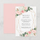 Stylish, elegant wedding enclosure cards featuring your wedding details surrounded by a faux gold geometric frame adorned with bouquets of blush pink watercolor roses and tulips with lush green and copper leaves. Personalise the card by adding important information such as hotel accommodations, wedding website, directions, etc.