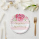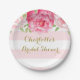Customisable name bridal shower party plates in light pastel pink blush and white stripes pattern with vintage pink watercolor flowers.