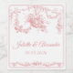 Add a touch of romantic French elegance to your wedding celebration with this personalised Toile de Jouy wedding bottle label in soft blush pink. Featuring an ornate vintage frame and a delicate cupid-and-floral illustration inspired by 18th-century French engravings, this design brings timeless charm and refined sophistication to your table décor.
